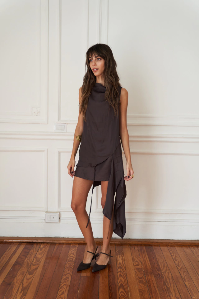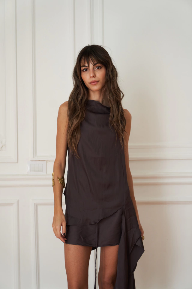 Blusa de seda con corte irregular con tiras para atar y entallar la cintura. Combinala con la falda carmela para un look completo.