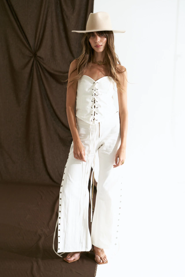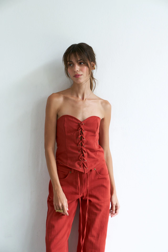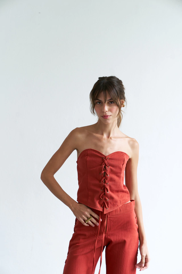 Corset de gabardina con elastico en espalda y tiras al frente para regular el ajuste.