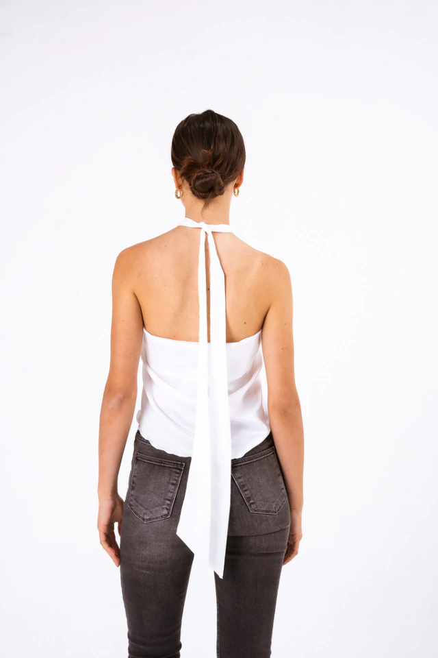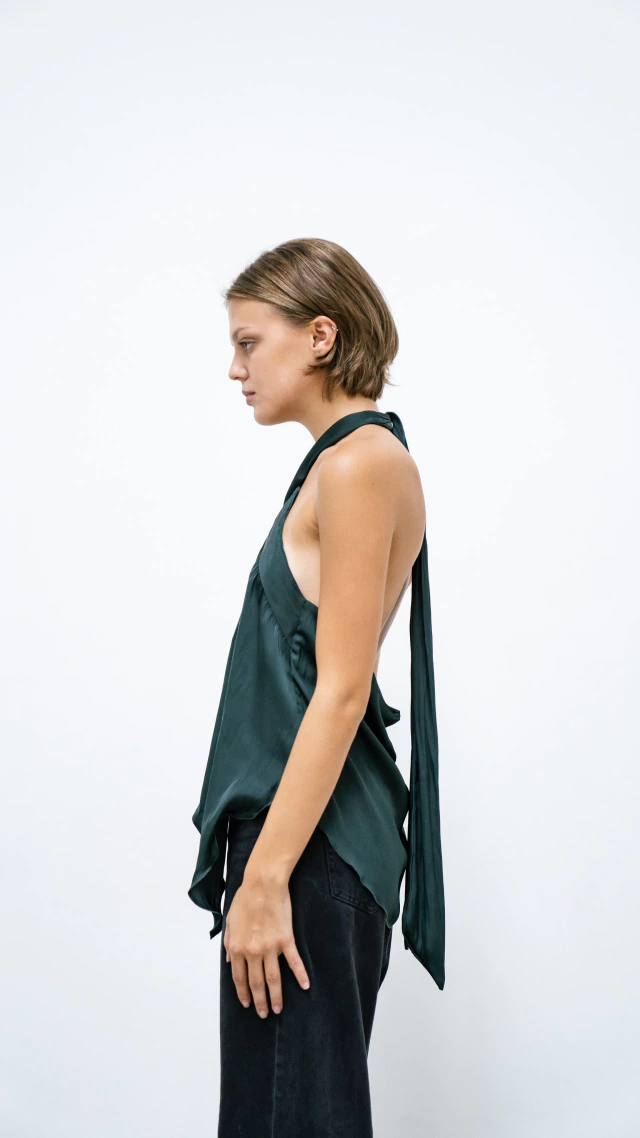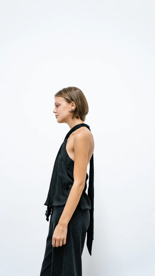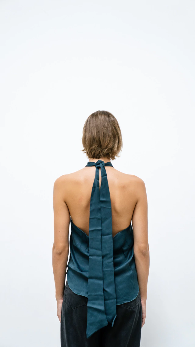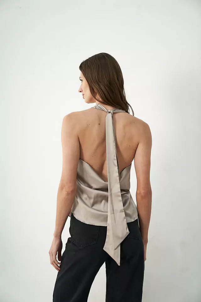 El Top Effy es un top de seda, con corte irregular y espalda abierta. Tiene dos lazos para cruzar sobre el pecho y atar por detrás de tu cuello.